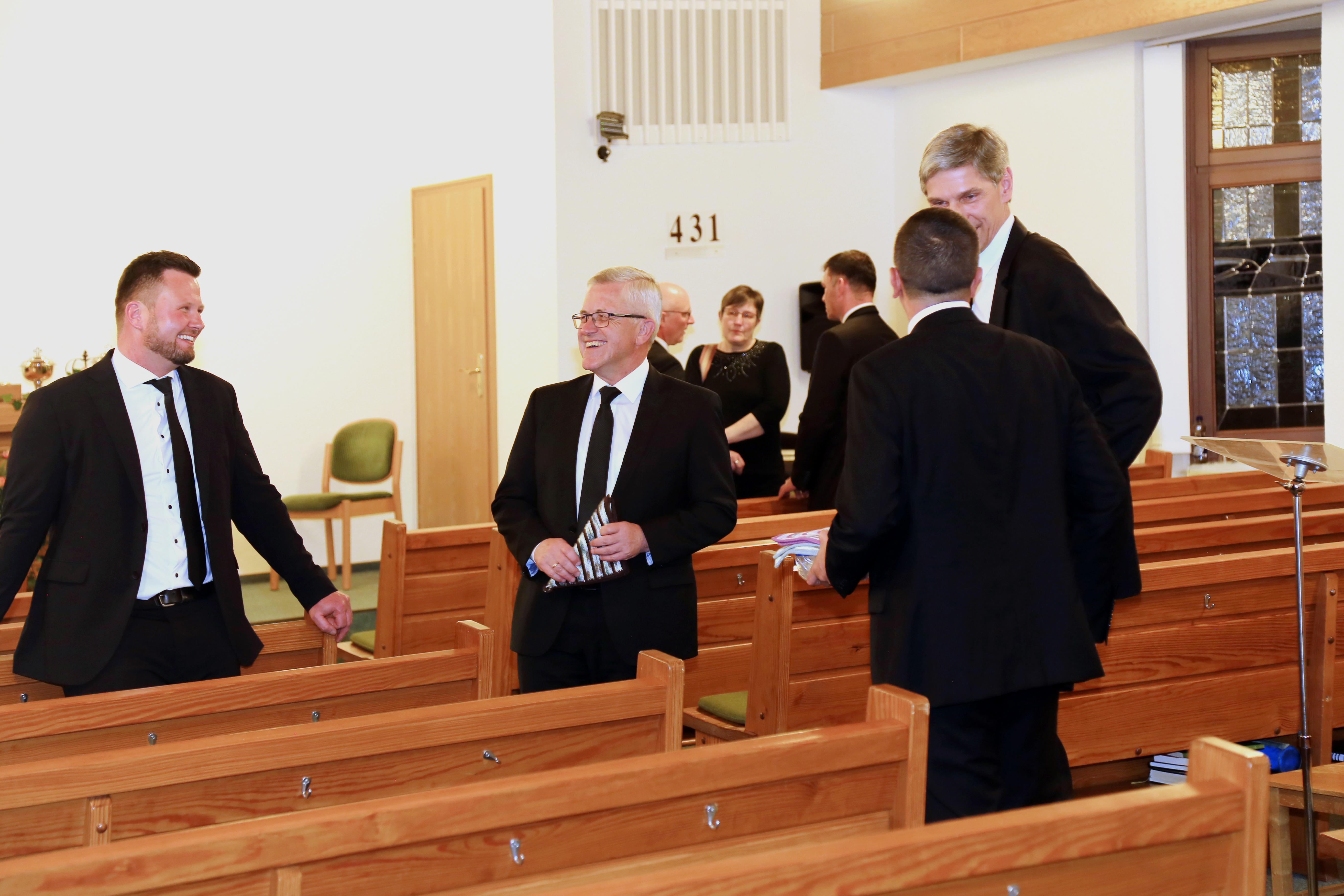 Nach dem Gottesdienst blieben zahlreiche Besucher noch zu Gesprächen zusammen. Gemeindeleiter Frank Ullmann überreichte Bezirksapostel Heynes und Apostel Woodmann jeweils einen Präsentkorb mit Spezialitäten und Erinnerungen aus Merseburg und der Region – verbunden mit herzlichem Dank und dem Wunsch, Merseburg bald wieder zu besuchen.